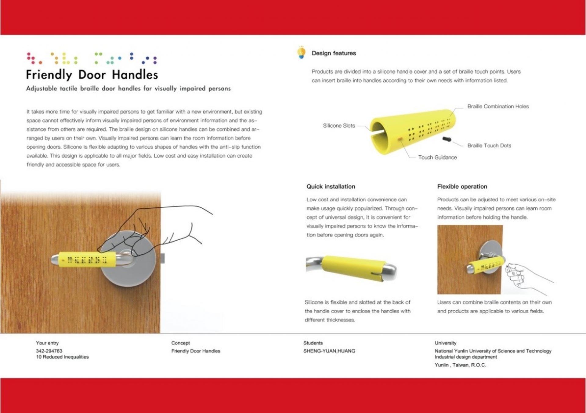 工設系「Friendly Door Handles」的作品:試想視障者在進入一個新環境需要更多的時間來熟悉,但現有空間無法有效告知視障者環境資訊,需要他人的協助。矽膠握把上設計可自行組合排列的點字功能,讓視障者在開門前得知房間資訊,矽膠具有彈性能適配各種造型握把,提供止滑功能。