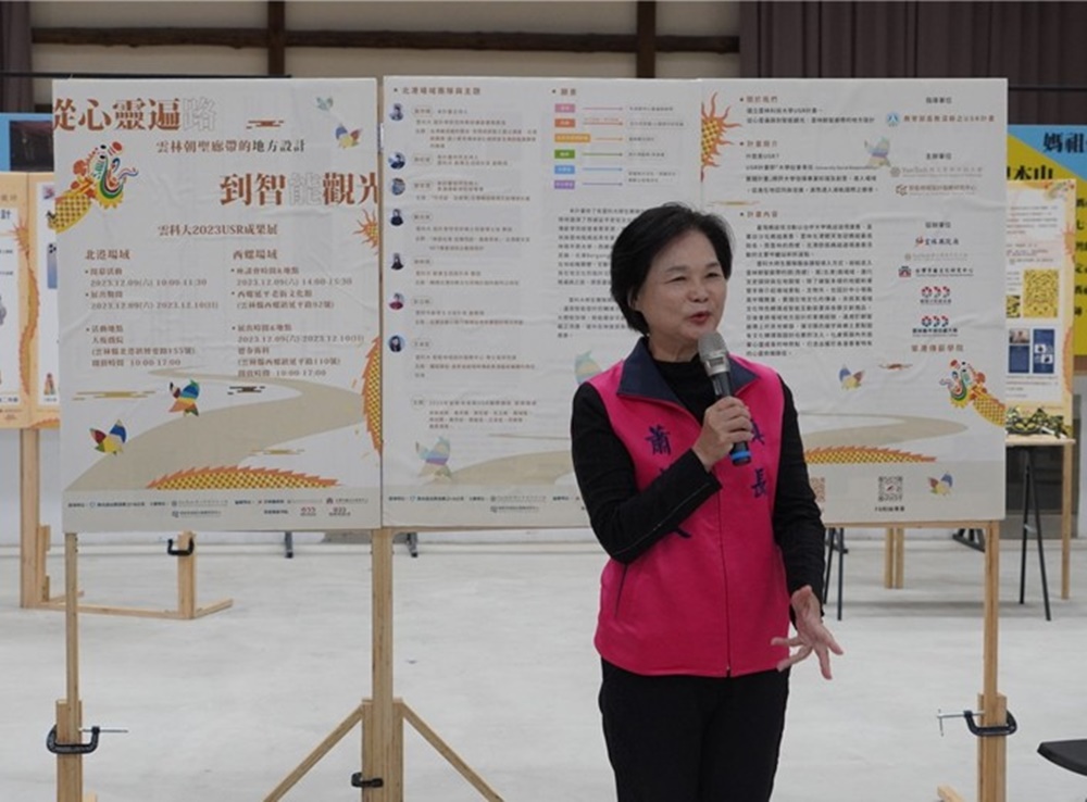 北港蕭美文鎮長親臨開幕會場致詞:北港最大的觀光資源是濃厚的宗教文化,以及多處古蹟、歷史建築。近年來也積極推動北港景點串聯和老建築活化,很高興能看見雲科大師生在北港地區的設計與智能結合傳統文化。