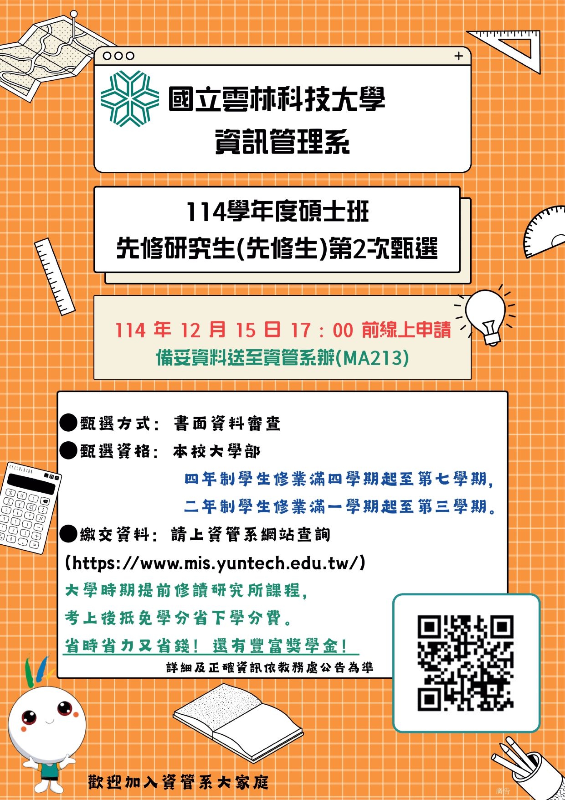 資管系114學年度碩士班先修研究生(先修生)第2次甄選~12/15前申請