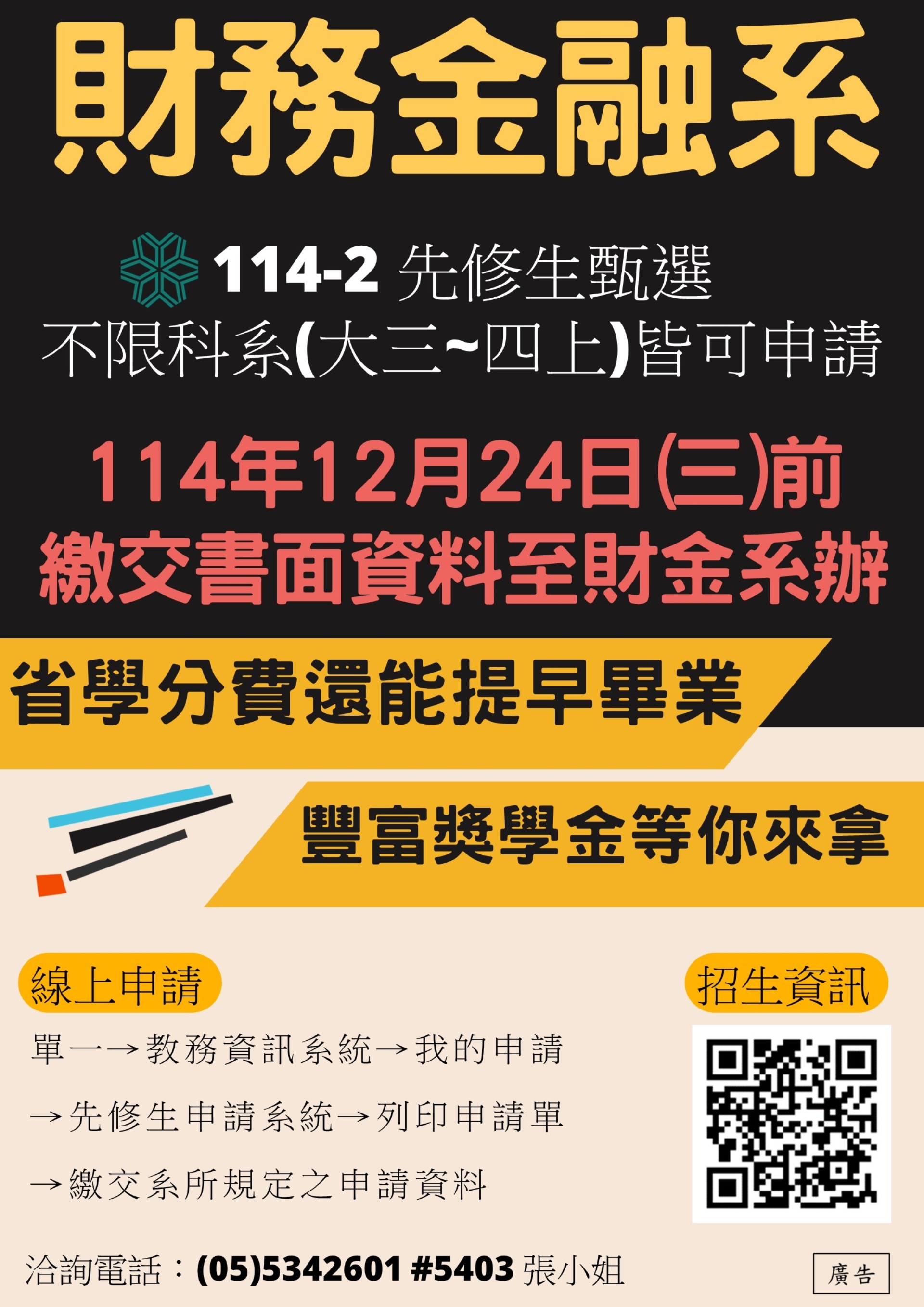 一、財金所先修生甄選報名請於114年12月24日(三)前備妥規定之申請資料向本所提出申請。