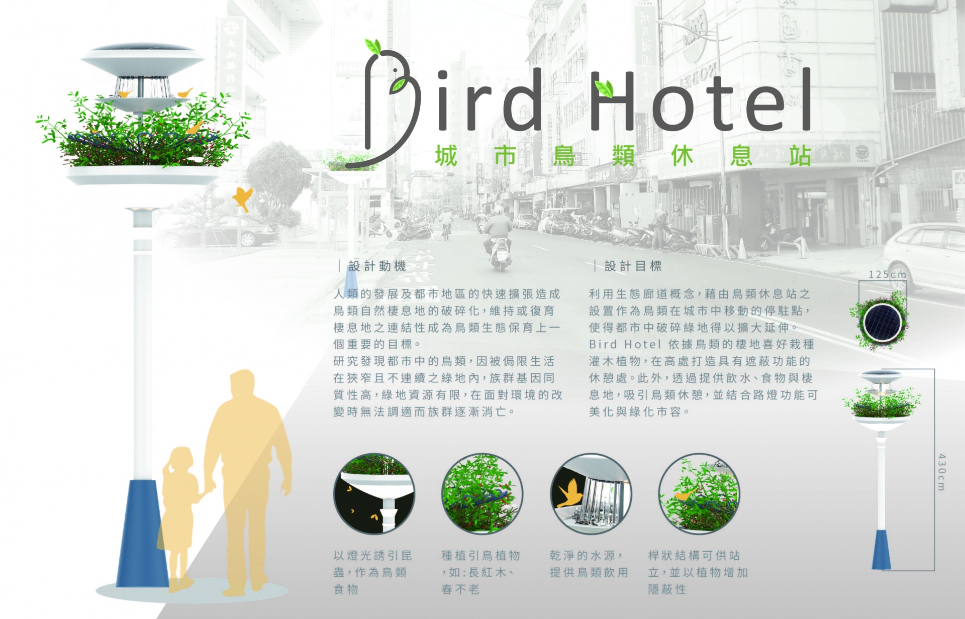 工設系張景旭老師帶領設計團隊洪琇琪同學、陳笠倫同學與黃子祐同學以作品「Bird Hotel 城市鳥類休息站」榮獲環境關懷設計競賽佳作,全體師生共賀。